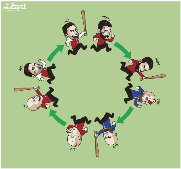 英超联赛食物链格局 阿森纳、切尔西、利物浦、曼联(表情符号) 漫画作品由泰国艺术家Kaew Justtoonit创作。